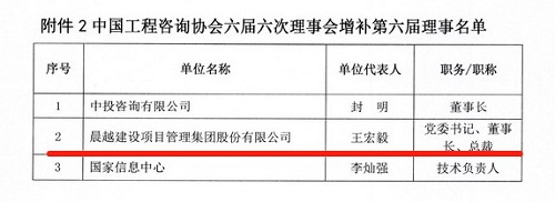 近日,《中國工程咨詢協會關于第六屆理事會第六次會議表決結果通知》(中咨協行業【2020】18號),宣布晨越建管集團為中國工程咨詢協會第六屆理事單位、特邀常務理事單位。一同被當選的還有國家信息中心等3家單位。