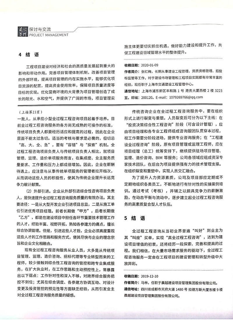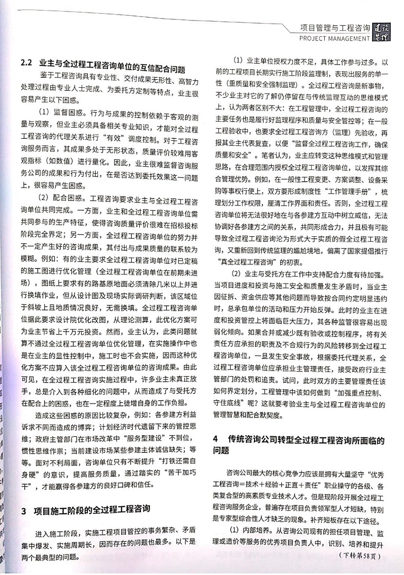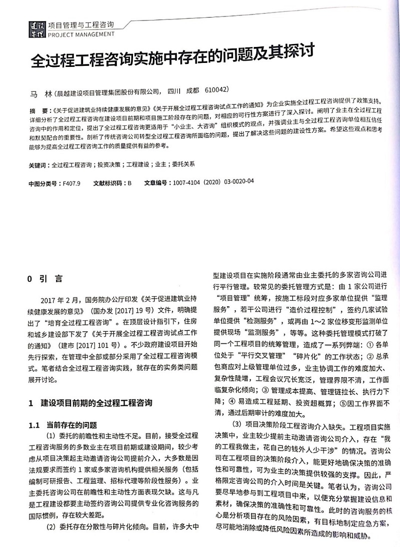 由集團公司馬林結合實際工作經歷與體會撰寫的《全過程工程咨詢實施中存在的問題及其探討》論文,近日在2020年第3期《建設監理》雜志發表。該論文以“寫實性”、近似“白描”的手法,就全過程工程咨詢在實施中存在的各類問題進行了探討與回顧,并提出了解決思路及辦法。對全過程工程咨詢模式在建設項目管理中的推廣,提升業主及咨詢企業的應對管理水平,具有重要的現實參考價值和借鑒意義。