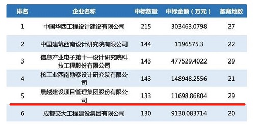 近日,建設庫大數據研究院發布四川省建筑業企業2020年第二季度100強榜單,本次數據統計來源于全國各省市建筑交易中心類網站所發布的中標通知書,統計范圍包括施工、監理、造價、勘察、設計等企業,信息來源權威、真實、有效。其中,中標數量超過100次的企業有11家,晨越建管集團位列第五名,在非設計類工程咨詢企業中排名第一,中標數量達133次。
