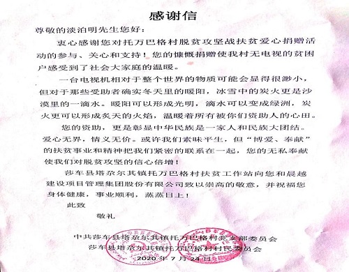2019年9月,晨越建管代建項目部為塔尕爾其鎮貧困戶捐款17,500元。