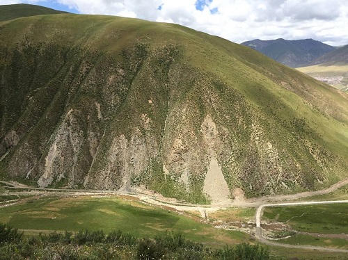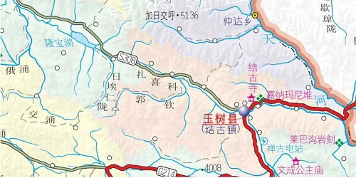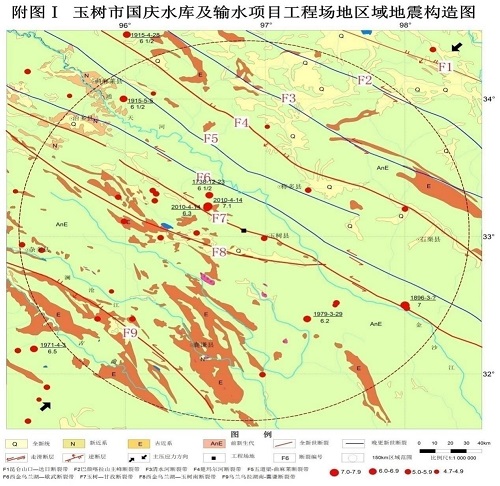國慶水庫工程位于玉樹市果青溝西溝唐古拉準地臺北部的巴塘臺緣褶帶部位,主要河流有巴塘河和扎西科河,二者在結古鎮匯合后以下河段稱之為扎曲河,最終注入通天河,屬長江上游通天河水系。工程周邊主要由兩岸山地、河床灘地及坡地構成(如圖3-1所示)。由于本區域距兩個一級構造單元唐古拉準地臺分界的烏蘭烏拉湖~玉樹南深大斷裂帶(26km)和玉樹~甘孜斷裂帶(1.4km)較近(圖3-2、圖3-3)。