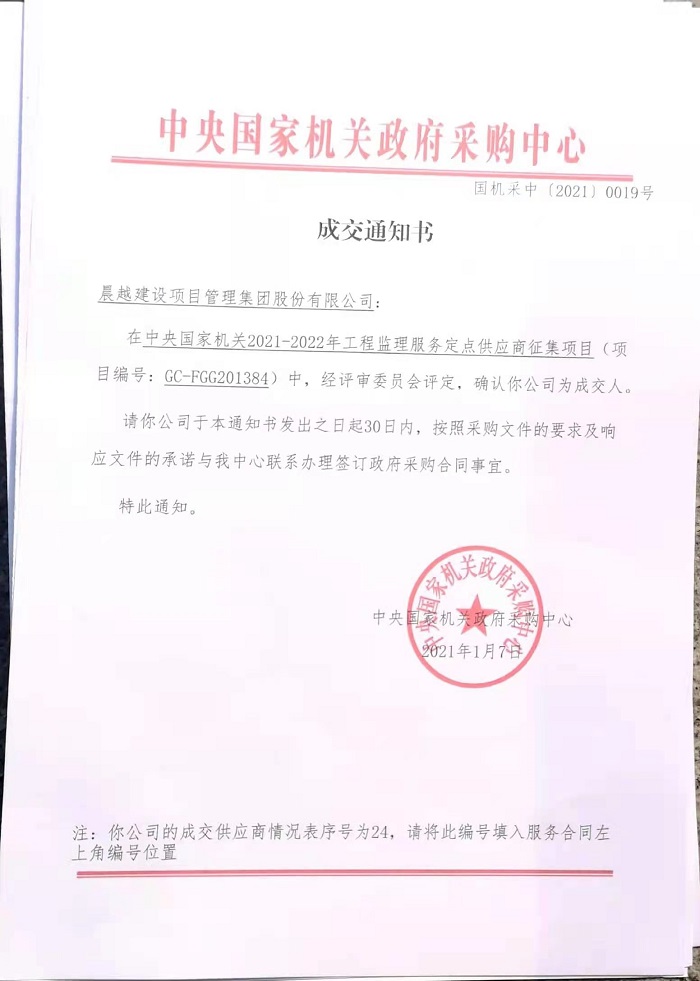 近日,集團收到中央國家機關政府采購中心《成交通知書》,確認晨越建管集團為“中央國家機關 2021-2022 年工程監理服務定點供應商征集項目” 成交人,承擔中央國家機關各部門及其在京所屬各級行政機關、事業單位和團體組織的工程監理服務。