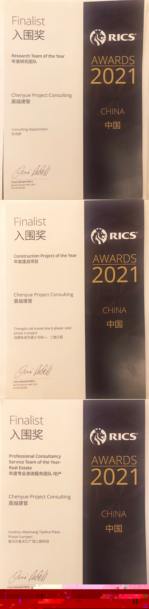 RICS中國獎頒獎典禮于峰會結束后召開。晨越建管集團憑借多年在工程領域的理論研究和咨詢實踐積累,參與了年度專業咨詢服務團隊-地產領域、年度研究團隊、年度建造項目三個組別的獎項角逐。年度專業咨詢服務團隊——地產領域(惠州萬象天匯廣場二期項目)、年度研究團隊(晨越建管咨詢部)、年度建造項目(成都軌道交通六號線一、二期工程)三項目獲入圍獎,其中年度建造項目(成都軌道交通六號線一、二期工程)獲得年度建造項目優秀獎。