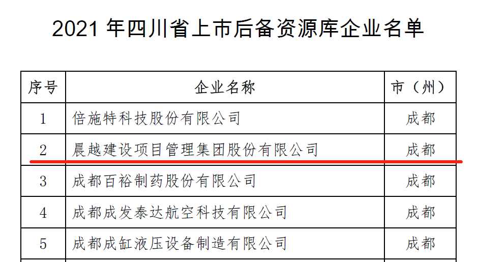 近日,四川省地方金融監督管理局發布《關于印發2021年四川省上市后備企業資源庫名單的函》,公布晨越建管集團納入2021年四川省上市后備企業資源庫。